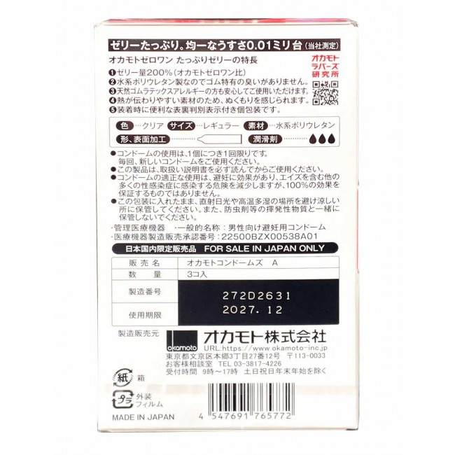 Description Polyurethane condoms OKAMOTO Zero One 0.01 Rich Jelly 3 pcs