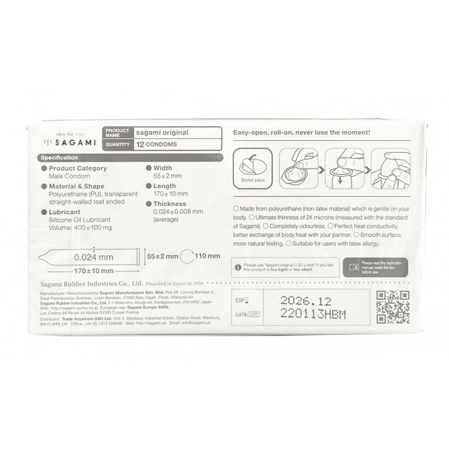 Specification SAGAMI Original 0.02 Polyurethane Condoms (12 pcs) ⭐️ SAGAMI Original ⭐️ japancondoms.com