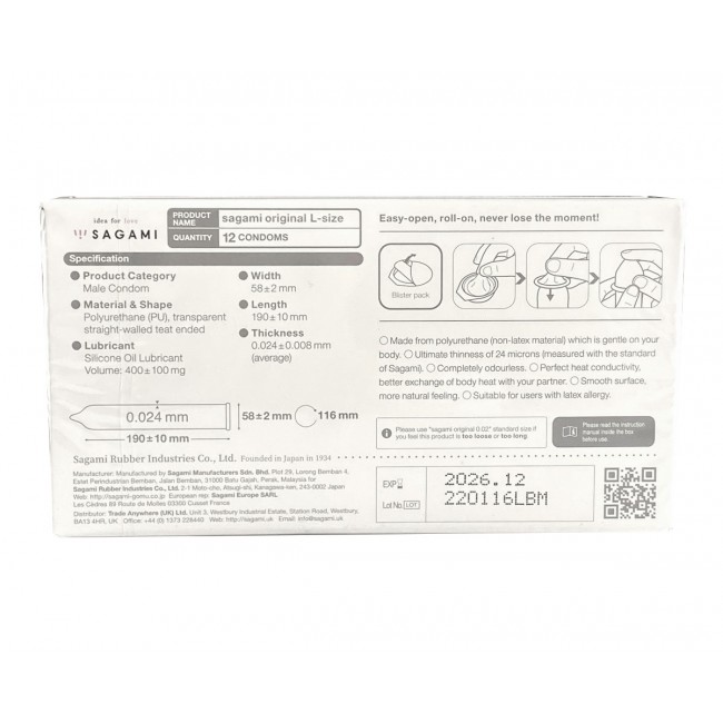 Specification SAGAMI Original 0.02 L-Size Polyurethane Condoms (12 pcs) ⭐️ SAGAMI Original ⭐️ japancondoms.com